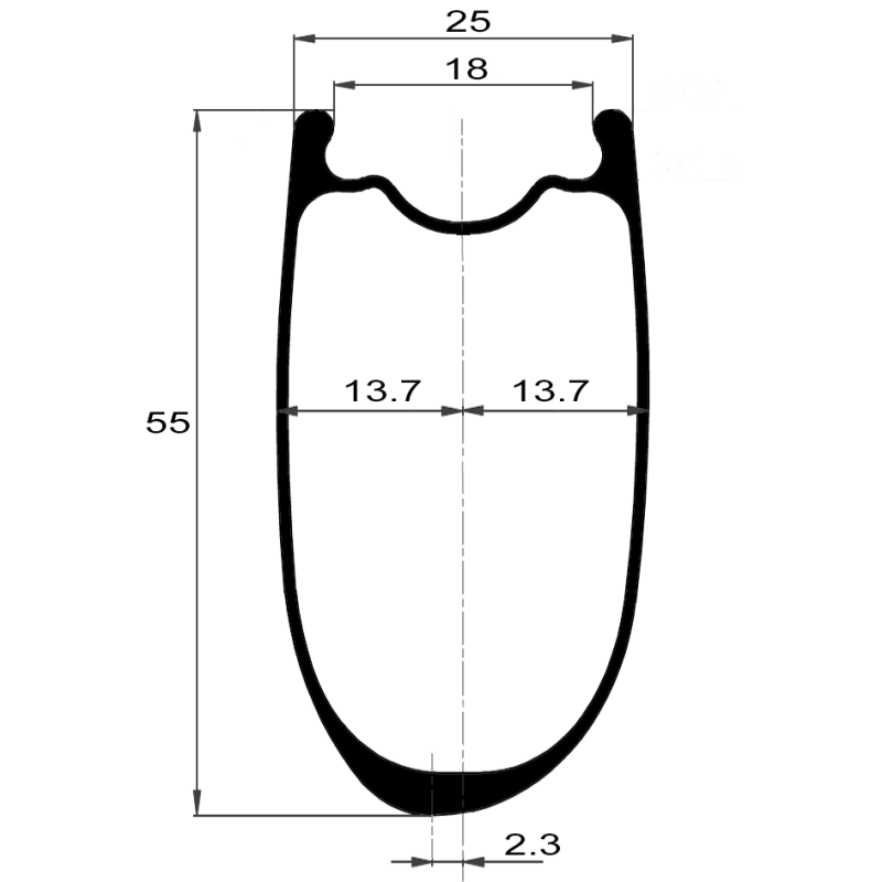 The DUKE Baccara 55C carbon (3k) twill 2x2 rim has an internal width between hooks / sides of 18mm.