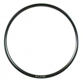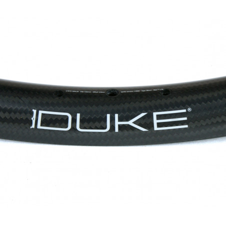 Comfort and grip thanks to a larger volume of air. It offers unrivaled lateral stiffness / weight ratio in its class and provides unusual sensations. Designed, developed and tested in France, The DUKE Crazy Jack in carbon has an ASYMMETRICAL profile (offset of 3 mm) which allows to increase the lateral stiffness of the wheel without gaining weight. The internal width between the hooks / sides is 28.5 mm. This gives more volume to the tires and improves efficiency, comfort and grip in turns.A wide rim also means that you can use finer, lighter tires while maintaining the comfort, softness and grip provided by a larger volume of air. Hookless design: the robustness of the rim is superior to that of a carbon rim with hooks. This technology has been used successfully on our rims since 2011. The height of the rim edge for 2015 is reduced by 1mm to further limit any risk of contact with the ground. Lateral stiffness improved by 40% compared to the previous version. Impact-resistant even on the most brittle ground: improved impact energy absorption of more than 50% compared to the previous model. Anti-burp system: the heel of the tire is held in position whatever its pressure, no risk of "unseating". Tubeless or inner tube.