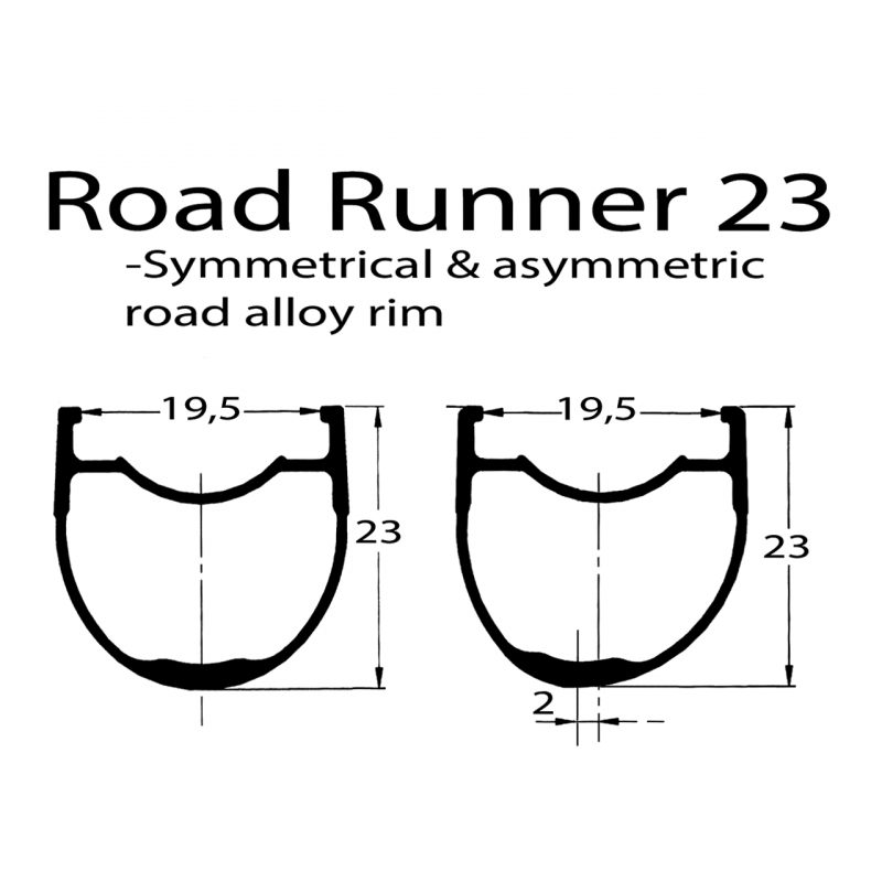 La jante DUKE Road runner 23 est dessinée, testée en France, DUKE est le propriétaire exclusif des outils de fabrication. La jante DUKE Road Runner possède une hauteur profil de 23 mm. Profil symétrique à l’avant et ASYMÉTRIQUE à l’arrière : avec l’augmentation du nombre de vitesses, la flasque côté cassette du moyeu se voit de plus en plus « poussée » vers l’intérieur de la roue. Le parapluie des rayons s’ouvre ainsi davantage et ceci a pour conséquence la réduction de la rigidité latérale de la roue : celle-ci est floue dans les relances, prend du voile facilement… Pour réduire ce phénomène nous avons dessiné une jante arrière asymétrique qui va donner un parapluie bien supérieur aux jantes symétriques (offset de 2 mm) et va permettre de rééquilibrer les tensions des deux nappes : plus de rigidité et plus de durabilité. Largeur entre crochets importante de 19,5 mm : Ceci donne davantage de volume aux pneus et améliore ainsi rendement, confort et adhérence dans les virages. Une jante large signifie également pouvoir utiliser des pneus plus fins et plus légers en conservant le confort, le moelleux et le grip procurés par un volume d’air plus important.