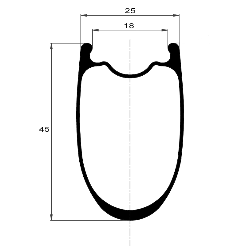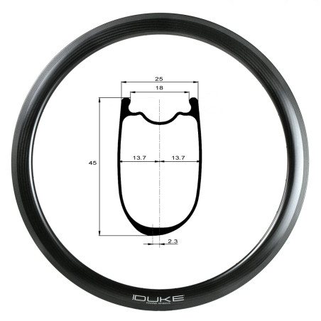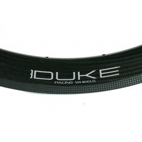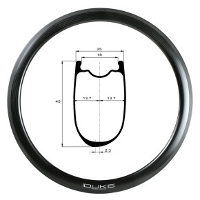 La jante DUKE Baccara 45C en carbone possède un profil ASYMÉTRIQUE à l’arrière: avec l’augmentation du nombre de vitesses, la flasque côté cassette du moyeu se voit de plus en plus «poussée» vers l’intérieur de la roue. Le parapluie des rayons s’ouvre ainsi davantage et ceci a pour conséquence la réduction de la rigidité latérale de la roue : celle-ci est floue dans les relances, prend du voile facilement… Pour réduire ce phénomène nous avons dessiné une jante arrière asymétrique qui va donner un parapluie bien supérieur aux jantes symétriques (offset de 2,3 mm) et va permettre de rééquilibrer les tensions des deux nappes : plus de rigidité et plus de durabilité. Largeur importante de 26mm : ce sont les largeurs modernes. Ceci permet de réduire la traînée aérodynamique et donc d’augmenter sa vitesse. Les roues sont également moins sensibles au vent latéral et la direction plus précise, le cycliste se sent plus en confiance. Largeur intérieure entre crochets/parois importante de 18 mm. Ceci donne davantage de volume aux pneus et améliore ainsi rendement, confort et adhérence dans les virages. Une jante large signifie également pouvoir utiliser des pneus plus fins et plus légers en conservant le confort, le moelleux et le grip procurés par un volume d’air plus important