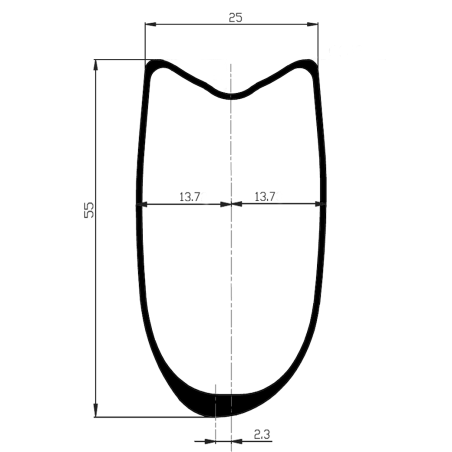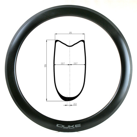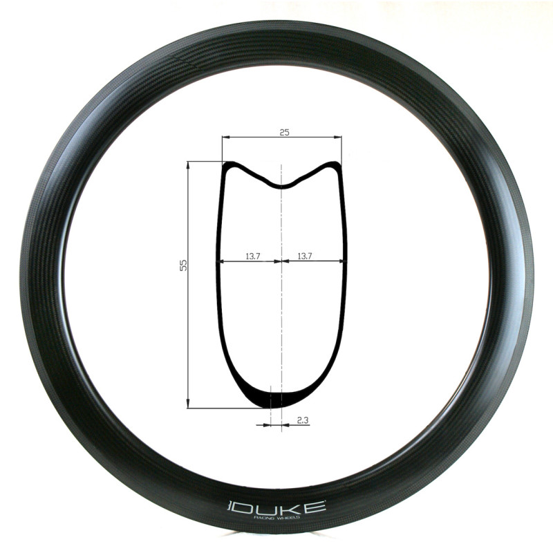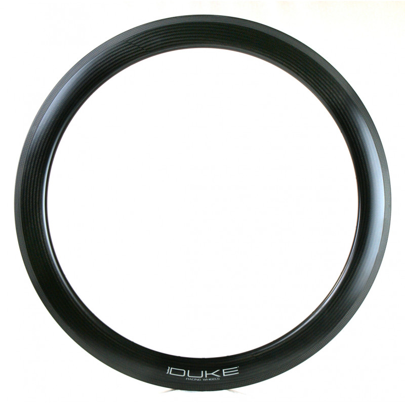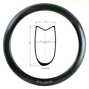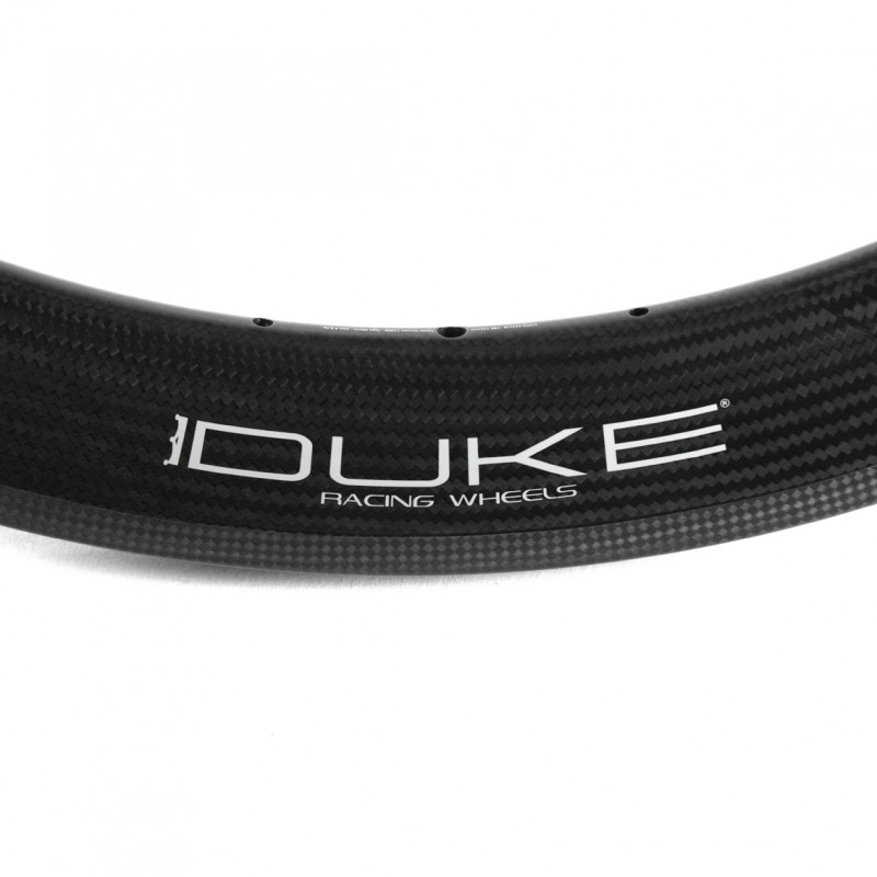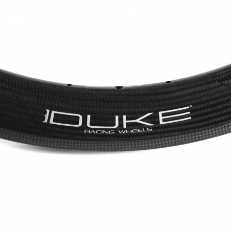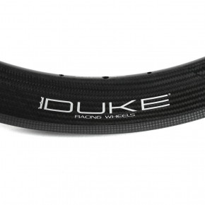Jante DUKE en carbone (3k) sergé 2×2, dessinée, développée et testée chez nous en Vendée, et fabriquée en Europe. La jante DUKE Baccara 55T en carbone possède une hauteur profil de 55 mm et une largeur importante de 26mm : ce sont les largeurs modernes. Ceci permet de réduire la traînée aérodynamique et donc d’augmenter sa vitesse. Les roues sont également moins sensibles au vent latéral et la direction plus précise, le cycliste se sent plus en confiance.Pour boyaux de 23 à 28mm de large, les boyaux de cette taille apportent rendement, confort et adhérence.