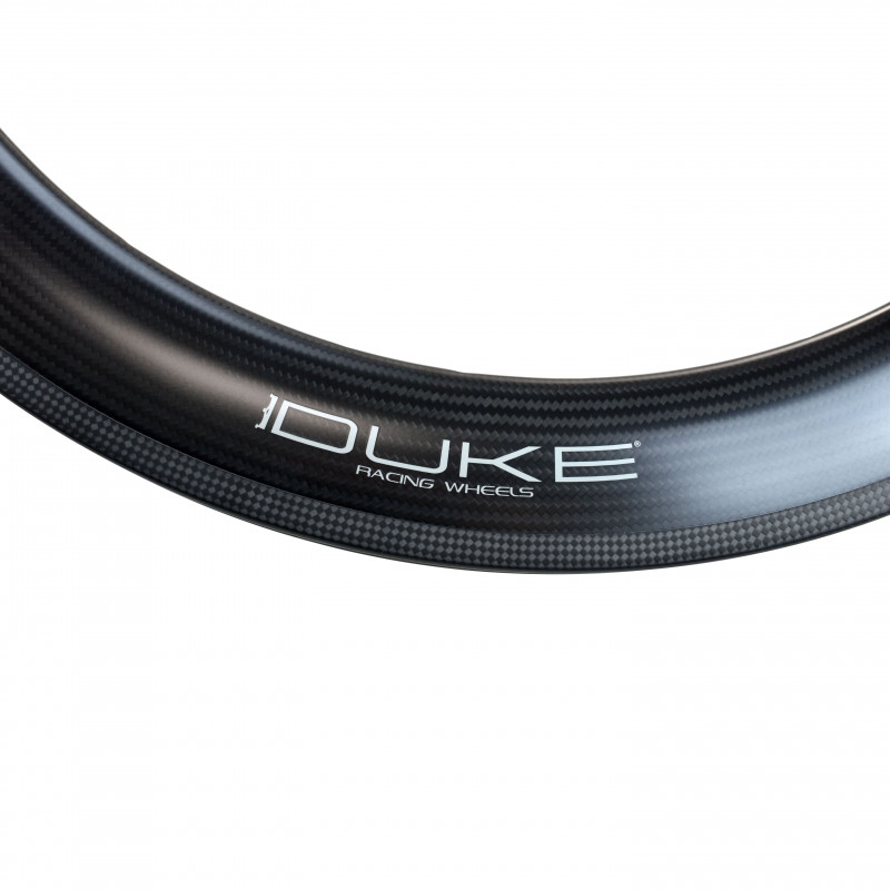 Jante DUKE en carbone (3k) sergé 2×2, dessinée, développée et testée chez nous en Vendée, et fabriquée en Europe. La jante DUKE Baccara 65T en carbone possède une hauteur profil de 65 mm et une largeur importante de 26mm : ce sont les largeurs modernes. Ceci permet de réduire la traînée aérodynamique et donc d’augmenter sa vitesse. Les roues sont également moins sensibles au vent latéral et la direction plus précise, le cycliste se sent plus en confiance. Pour boyaux de 23 à 28mm de large, les boyaux de cette taille apportent rendement, confort et adhérence.