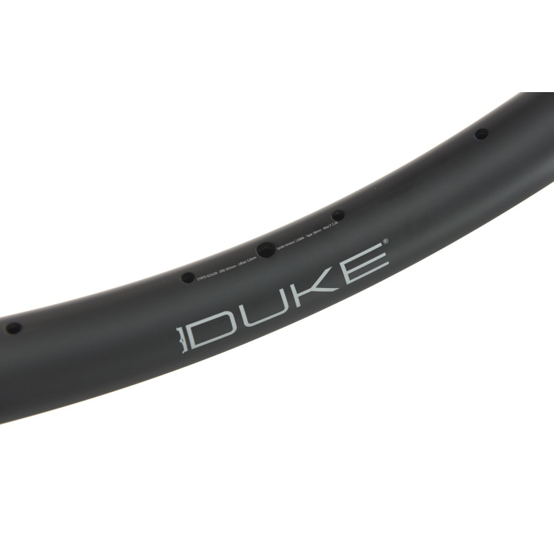 Jante en carbone destinée à un usage All Mountain et Enduro. Sa largeur importante optimise le comportement du pneumatique et favorise ainsi le rendement, le confort et l'adhérence grâce à un volume d'air contenu plus important. Elle offre un rapport rigidité latérale /poids inégalé dans leur catégorie et procure des sensations hors norme. Dessinée, développée et testée en France, la DUKE Crazy Jack en carbone possède un profil ASYMÉTRIQUE (offset de 3 mm) qui permet d'augmenter la rigidité latérale de la roue sans prendre de poids. La largeur intérieure entre crochets/parois importante est de 28,5 mm. Ceci donne davantage de volume aux pneus et améliore ainsi rendement, confort et adhérence dans les virages. Une jante large signifie également pouvoir utiliser des pneus plus fins et plus légers en conservant le confort, le moelleux et le grip procurés par un volume d’air plus important.