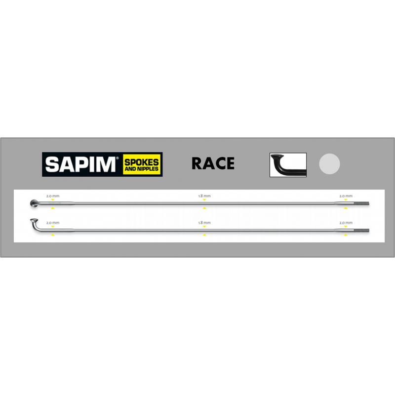 Le rayon Sapim Race coudé (J) est de le rayon "double butted" 2,0/1,8/2,0mm le plus répandu. La mise en tension est facile. Il est rigide et robuste. Sa section centrale plus étroite de 1,8mm le rend plus confortable que les rayons à section constante. Il convient pour tous les montages économiques.