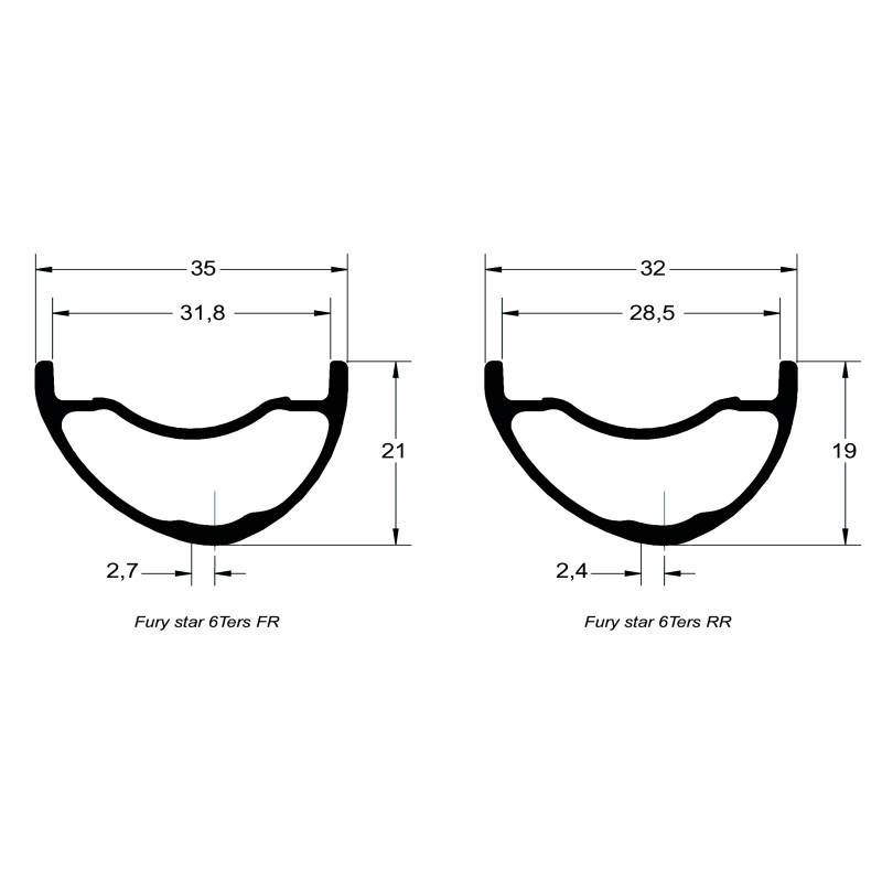 Les Fury Star 6TERS sont des jantes en aluminium prévues pour un usage Enduro. Les largeurs avant/arrière sont différenciées: 32mm/28.5mm. Les jantes sont aussi compatibles avec le VAE. Ces jantes sont utilisées en Enduro World Series par le Team Commençal - Les Orres, le Team Scott - SR Suntour et par bien d'autres coureurs