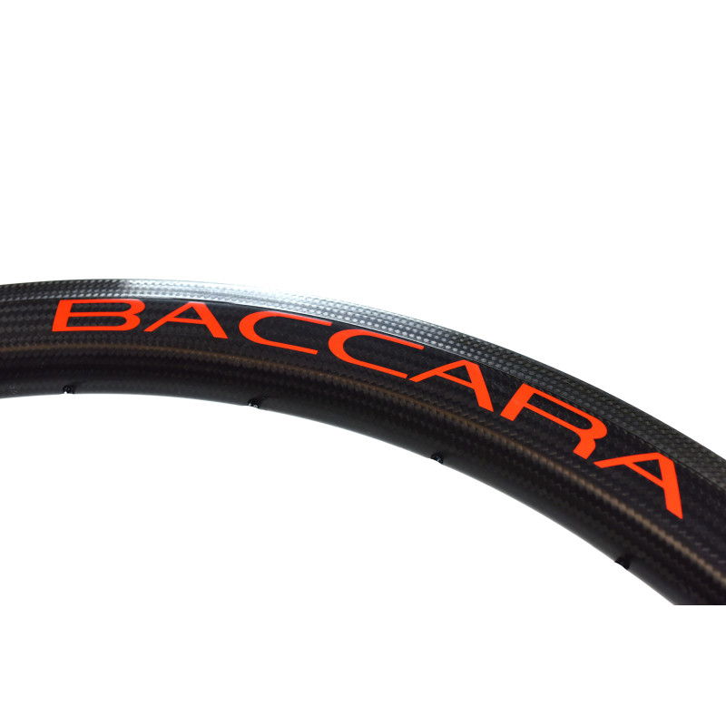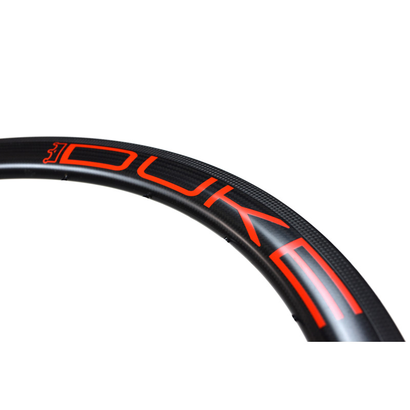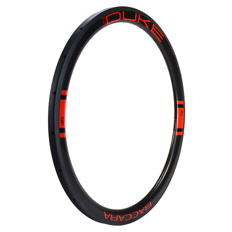 La jante DUKE Baccara 45T en carbone possède un profil ASYMÉTRIQUE à l’arrière : avec l’augmentation du nombre de vitesses, la flasque côté cassette du moyeu se voit de plus en plus « poussée » vers l’intérieur de la roue. Le parapluie des rayons s’ouvre ainsi davantage et ceci a pour conséquence la réduction de la rigidité latérale de la roue : celle-ci est floue dans les relances, prend du voile facilement… Pour réduire ce phénomène nous avons dessiné une jante arrière asymétrique qui va donner un parapluie bien supérieur aux jantes symétriques (offset de 2,3 mm) et va permettre de rééquilibrer les tensions des deux nappes : plus de rigidité et plus de durabilité. Largeur importante de 26mm : ce sont les largeurs modernes. Ceci permet de réduire la traînée aérodynamique et donc d’augmenter sa vitesse. Les roues sont également moins sensibles au vent latéral et la direction plus précise, le cycliste se sent plus en confiance. Pour boyaux (23 ou 25mm de large) : les boyaux de cette taille apportent rendement, confort et adhérence.