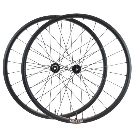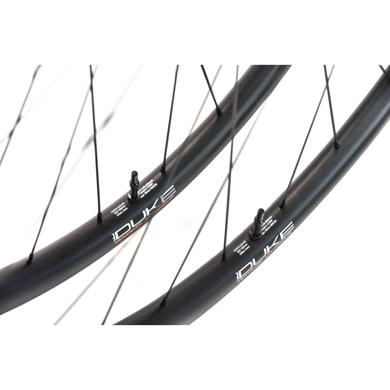 Version pour freinage disque uniquement. Les perçages de la jante sont décentrés (2mm offset), ce qui permet de fermer davantage le parapluie des rayons. Ainsi la jante est plus stable et la rigidité latérale de la roue est augmentée. Les tensions des rayons entre les deux nappes sont plus équilibrées, ce qui garantit une meilleure durabilité de la roue. Donc plus de rigidité et plus de durabilité. La largeur entre crochet plus importante de 25mm, donne d'avantage de volume aux pneus et améliore le confort et l'adhérence sans perdre en rendement. DUKE est propriétaire de ses outils de fabrication.