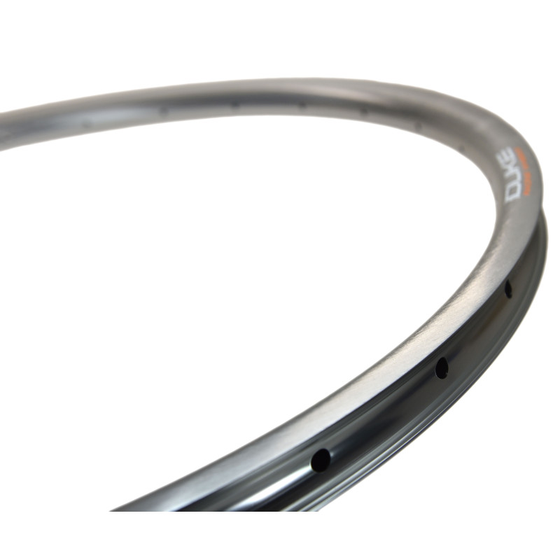 La jante DUKE world runner X 25 argent en aluminium brossé et anodisé. Dessinée, testée en France, DUKE est le propriétaire exclusif des outils de fabrication. La jante DUKE world Runner possède une hauteur profil de 25 mm. Profil ASYMÉTRIQUE avant et arrière : avec l'apparition du disque à l'avant et l’augmentation du nombre de vitesses, côté cassette les flasques du moyeu se voit de plus en plus « poussée » vers l’intérieur de la roue. Le parapluie des rayons s’ouvre ainsi davantage et ceci a pour conséquence la réduction de la rigidité latérale de la roue : celle-ci est floue dans les relances, prend du voile facilement… Pour réduire ce phénomène nous avons dessiné une jante asymétrique qui va donner un parapluie bien supérieur aux jantes symétriques (offset de 2 mm) et va permettre de rééquilibrer les tensions des deux nappes : plus de rigidité et plus de durabilité. Largeur entre crochets importante de 25 mm : Ceci donne davantage de volume aux pneus et améliore ainsi rendement, confort et adhérence dans les virages. Une jante large signifie également pouvoir utiliser des pneus plus fins et plus légers en conservant le confort, le moelleux et le grip procurés par un volume d’air plus important.