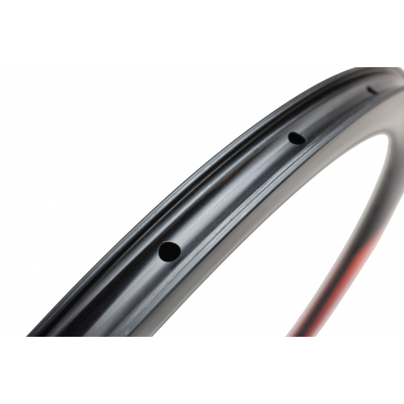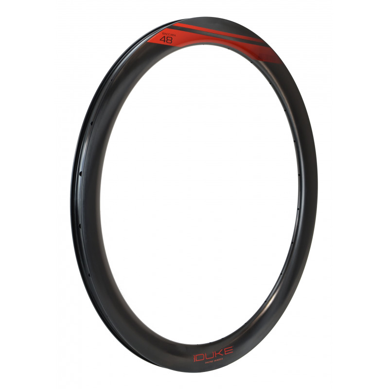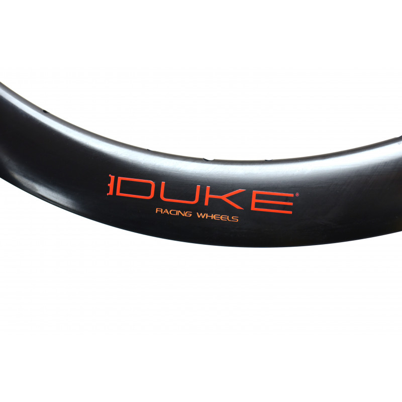 Nouvelle jante DUKE en carbone UD, dessinée, développée et testée en interne. Pour ses jantes, DUKE est propriétaire des outils de fabrication ! Les nouvelles jantes DUKE Baccara SLS2* sont la dernière évolution des incontournables Baccara 3K. Elles sont maintenant disponibles en 6 hauteurs: 36, 42, 48, 56, 65 et 78mm, freinage disque ou patins, profil symétrique ou asymétrique. Pour cette nouvelle génération, nous avons travaillé sur 3 points: le poids, le confort et l'aérodynamisme. Grace à la technologie SLS2 nous avons abaissé le poids de 10%, dû à l'usage de fibres haut module et d'un tout nouveau process de moulage en enceinte étanche avec des résines de nouvelle génération. Ce procédé permet également une meilleure filtration des vibrations engendrées par la granulométrie du bitume. Le confort s'en trouve amélioré. La largeur intérieure entre crochets est plus importante avec 21 mm. Ceci donne davantage de volume aux pneus et améliore ainsi rendement, confort et adhérence dans les virages. Une jante large signifie également pouvoir utiliser des pneus plus fins et plus légers en conservant le confort, le moelleux et le grip procurés par un volume d’air plus important. Les largeurs de pneus conseillées sont 25mm et 28mm, tubeless ou tubetype. Le profil de la jante a été retravaillé afin d'améliorer son aérodynamisme et sa stabilité dans toutes les conditions de vent. La largeur extérieure est plus importante avec 27,6 mm et possède une nouvelle forme en ogive. Ceci permet de réduire la traînée aérodynamique et donc d’augmenter sa vitesse. Les roues sont aussi moins sensibles au vent latéral et la direction plus précise, le cycliste se sent plus en confiance. Les meilleurs résultats sont obtenus avec des pneus de 25mm. Elle conserve également une version avec profil asymétrique de 2mm (pour les hauteurs de 36, 42 et 48mm). Avec l’augmentation du nombre de vitesses, la flasque côté cassette du moyeu se voit de plus en plus recentrée vers l’intérieur de la roue. Le parapluie des rayons s’ouvre davantage et ceci réduit la stabilité et la rigidité latérale de la roue : celle-ci est floue dans les relances, prend du voile facilement. L'asymétrie donne un parapluie bien supérieur aux jantes symétriques et permet de rééquilibrer les tensions des deux nappes pour plus de rigidité et plus de durabilité.
