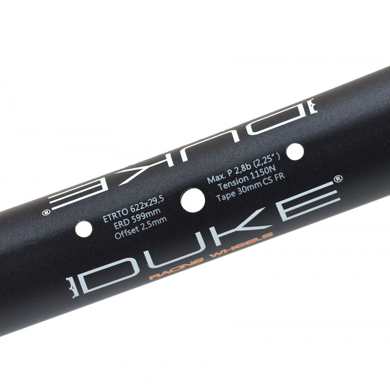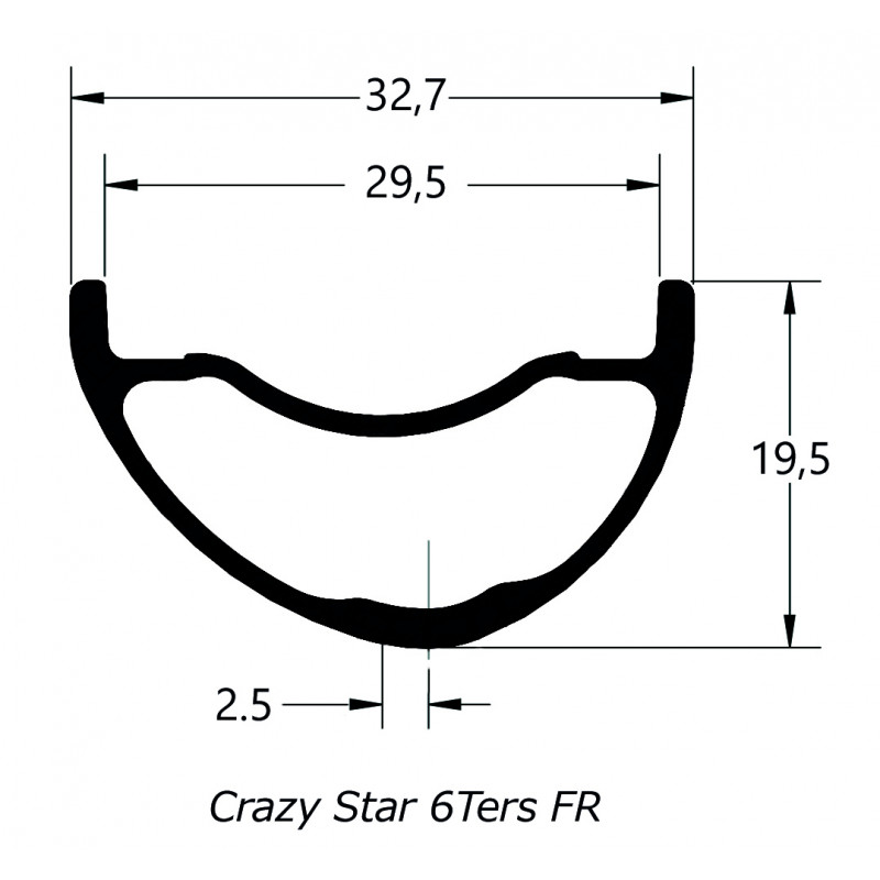 Jante destinée à un usage Trail et All Mountain. Sur ses jantes, DUKE est propriétaire exclusif des outils de fabrication. Elle offre une très bonne rigidité latérale et une largeur intérieure très importante pour améliorer le comportement du pneumatique. Elle est conseillée sur tous types de terrains. La jante DUKE Crazy Star 6Ters est plus large à l'avant de 3 mm et plus haute de 1.5 mm. Elle possède un profil ASYMÉTRIQUE (offset de 2.5 mm) qui permet d'augmenter la rigidité latérale de la roue sans prendre de poids. Les perçages de la jante sont décentrés, ceci permet de fermer davantage le parapluie que forment les rayons. Ainsi les rayons assurent un meilleur maintien de la jante et la rigidité latérale de la roue est augmentée. Le risque de prise de voile est également diminué. De plus, cet artifice permet d'équilibrer davantage les tensions des rayons entre les deux nappes et garantit ainsi une meilleure durabilité de la roue. La largeur intérieure entre crochets importante est de 29,5 mm. Ceci donne davantage de volume aux pneus et améliore ainsi rendement, confort et adhérence dans les virages. Une jante large signifie également pouvoir utiliser des pneus plus fins et plus légers en conservant le confort, le moelleux et le grip procurés par un volume d’air plus important. Des pneus plus larges offriraient encore davantage de volume d’air mais ils sont lourds et peu dynamiques. La meilleure combinaison pneu/jante est obtenue quand un pneu relativement fin est monté sur une jante large. Le pneu devient ainsi plus large. Cette combinaison diminue également les phénomènes de roulement du pneu sous la jante dans les changements d’appuis. Avec une jante étroite et un pneu large, la jante flotte d’un côté à l’autre de la jante sans tenue. En utilisant une jante large et un pneu fin, on minimise le phénomène de flottement et on améliore le comportement et le contrôle du vélo.
